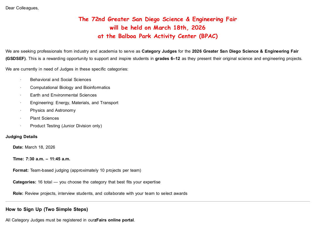 The Greater San Diego Science fair is looking for judges for the upcoming event on March 18th. It is a great way to give back to the community for the next